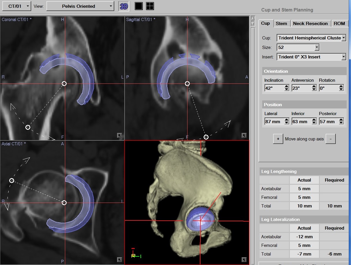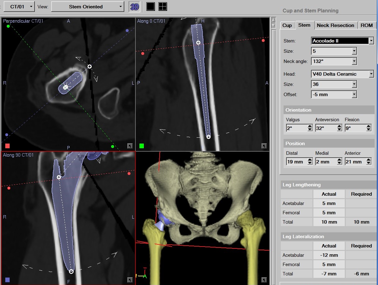 手術を受ける患者さん全員にCTを撮影し、患者さん一人一人の骨格、関節の大きさや変形、左右差を評価します。CTの情報をコンピューターに入力し、人工関節の3次元情報と重ね合わせることで、最適な人工関節の機種を選択し、使用するサイズや設置位置、角度、左右差などを綿密に計画します。(図1、2)
