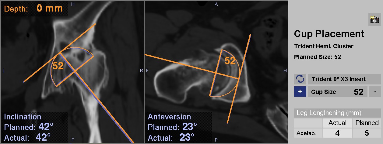 手術前計画を正確、安全、確実に行うために、人工股関節手術時にはナビゲーションを使用します。手術に熟練していても人間の感覚には限界があります。ナビゲーションを使用する事で1度1㎜単位での正確で再現性の高い計画通りの手術が可能になります。その上で関節の柔軟性や可動域を加味した微調整を行うことで、患者さんにとって最善の手術を提供します。(図3)