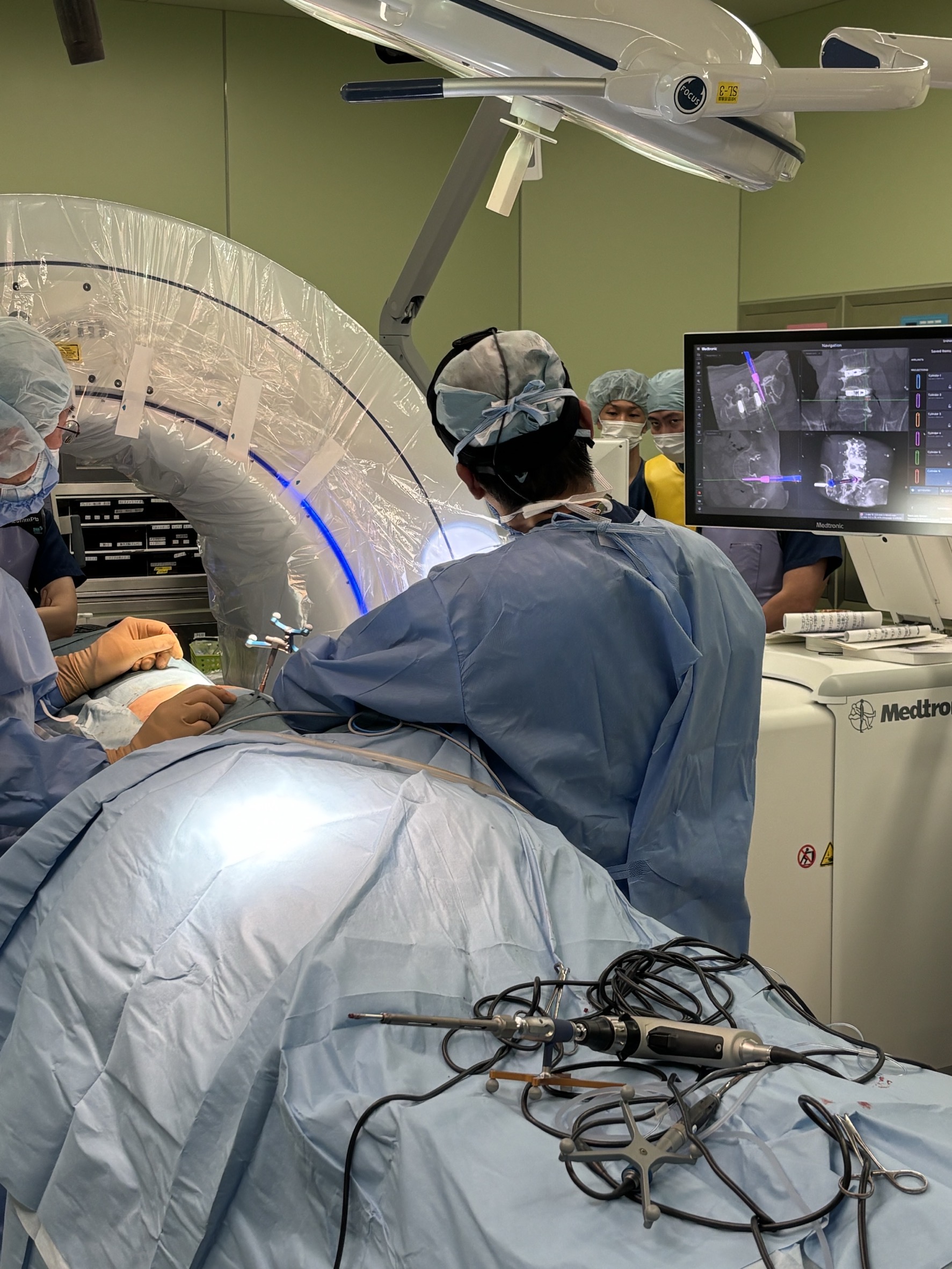 脊椎手術ではスクリューによる変形の矯正や人工椎体などによる固定を行うことも多く、これらを安全かつ正確に行うために脊椎ナビゲーションを使用することは世界標準となっています(図2)。