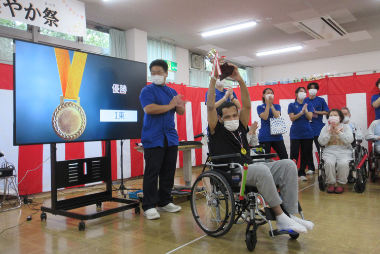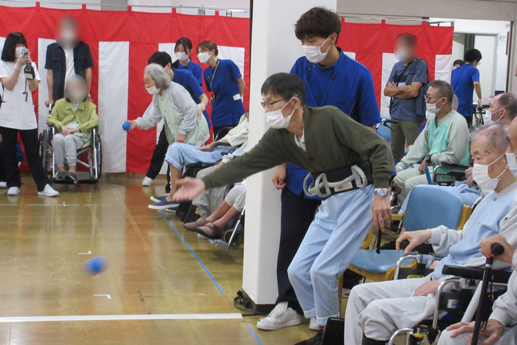 ボッチャ大会では、病棟対抗でボッチャを行いました。トーナメント表を使用し、チーム一丸となって優勝を目指しました。大きな歓声が上がるほど患者様もご家族様も盛り上がっていました。