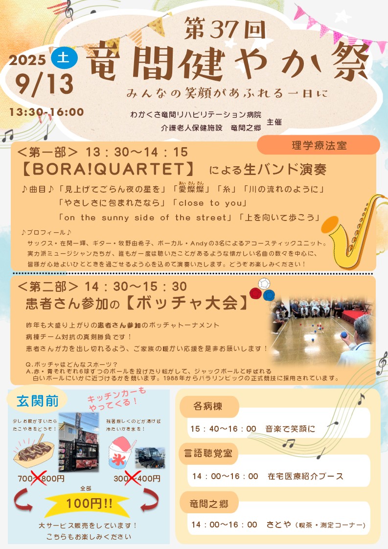 第一部の演奏会では「BORA!QUARTET」様をお招きしてバンド演奏(ボーカル・サックス・ギター)を行って頂く予定です。是非、皆様にお楽しみ頂きたいと思います。第二部では病棟対抗でのボッチャ大会を行います。ボッチャという競技は年齢、性別、身体の状態にかかわらず全ての人が共に競い合えるスポーツです。その他にも各病棟での音楽鑑賞や在宅医療紹介ブース、玄関前には飲食エリアとしてキッチンカーが出店(たこ焼き・かき氷 各100円)します。また竜間之郷においても催しを企画していますので、気軽にお立ち寄りください。