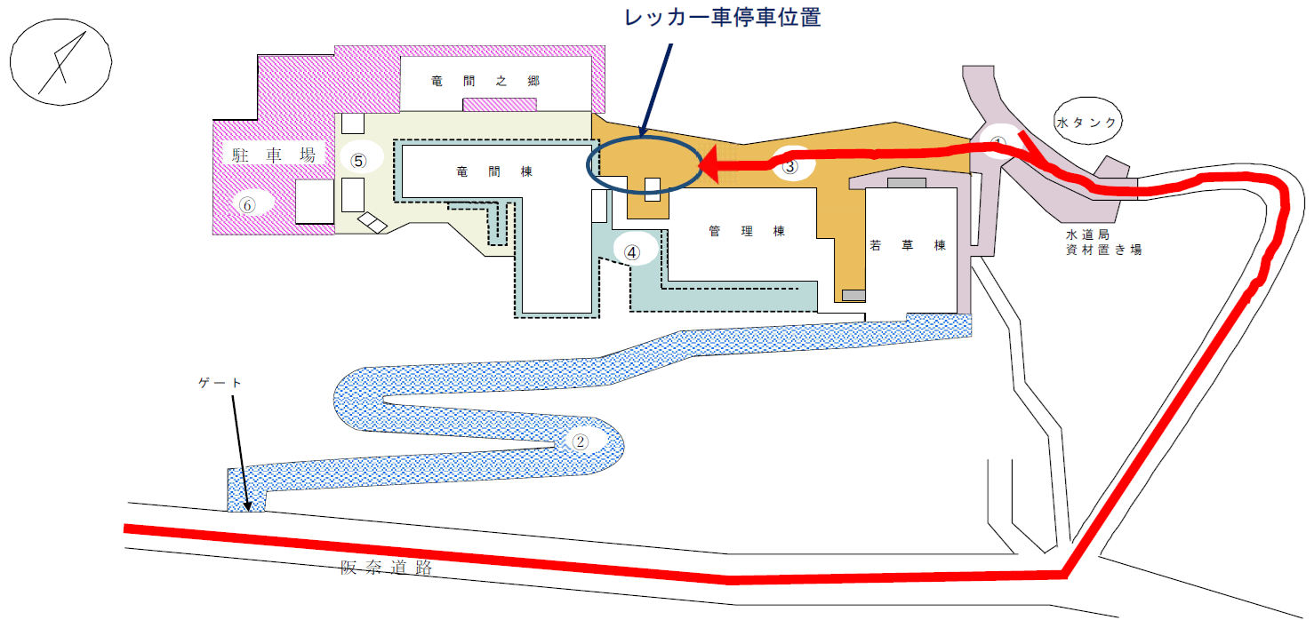 レッカー車の通行経路は赤矢印のとおりです。阪奈道路から龍間自治区の道路を通って当院へ入り、竜間之郷連絡通路横の消防空地に停止させます。レッカー車が通行できなくなるため、赤矢印がある道路沿いはすべて駐車禁止にいたします。(駐車枠がある場所でもこの日は駐車禁止となります。管理棟横3 台分も駐車禁止です。) ご理解ご協力のほどよろしくお願いいたします。なお、奥の駐車場⑥まで通行は可能です。