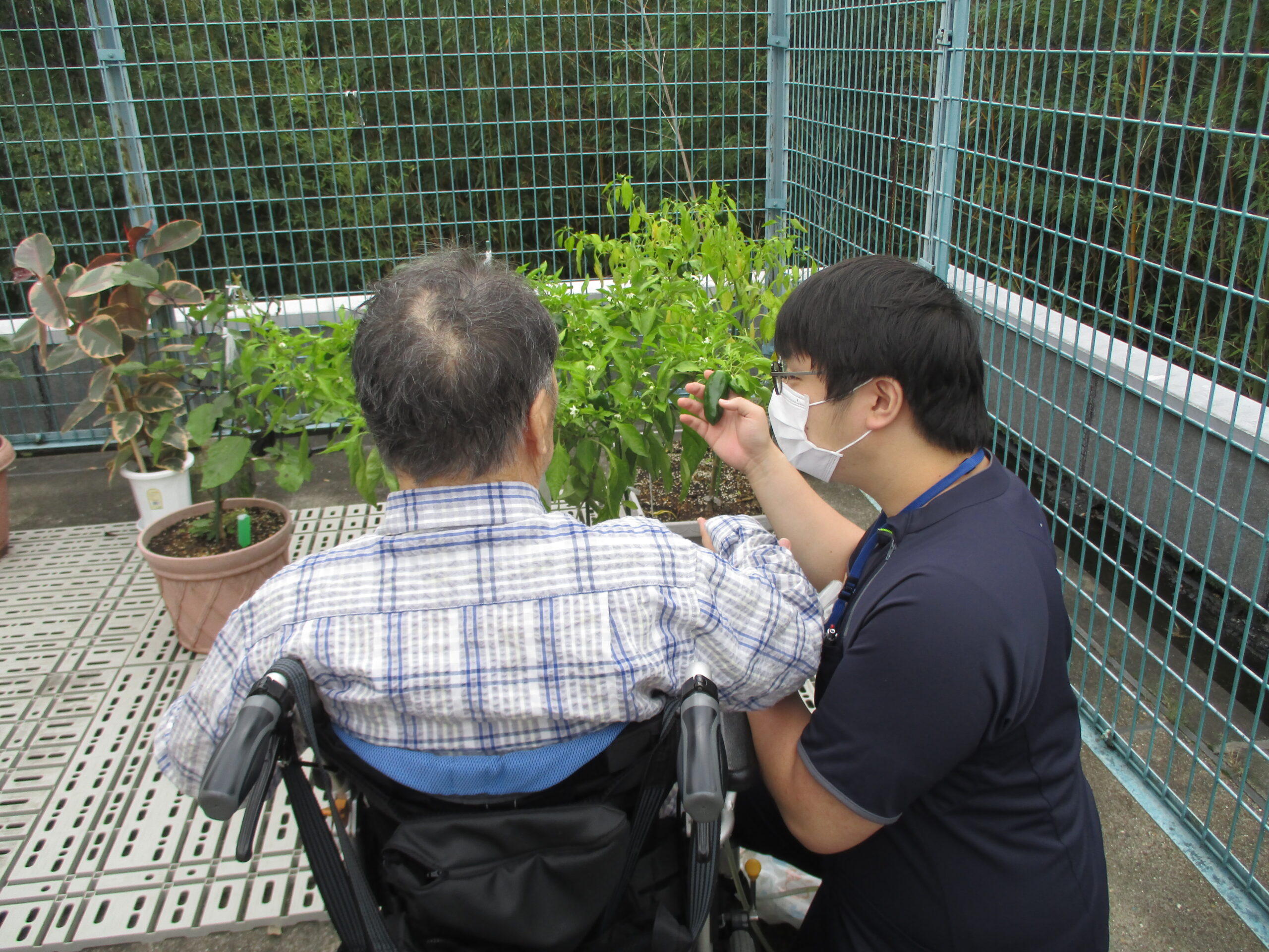 施設における介護職の仕事内容は、主に、生活に伴う身体介護(食事・排泄・入浴・整容・移乗と移動など)や利用者さんの健康管理、リハビリテーション(機能訓練)、レクリエーションなどです。病気や障害により、自宅での日常生活が困難な利用者さんが、在宅で自立した生活ができるよう、介護職はリハビリ職員や支援相談員と協力し、ご自宅の間取りや設備を確認させていただいたうえで、利用者さん・ご家族に介護指導を行っています。